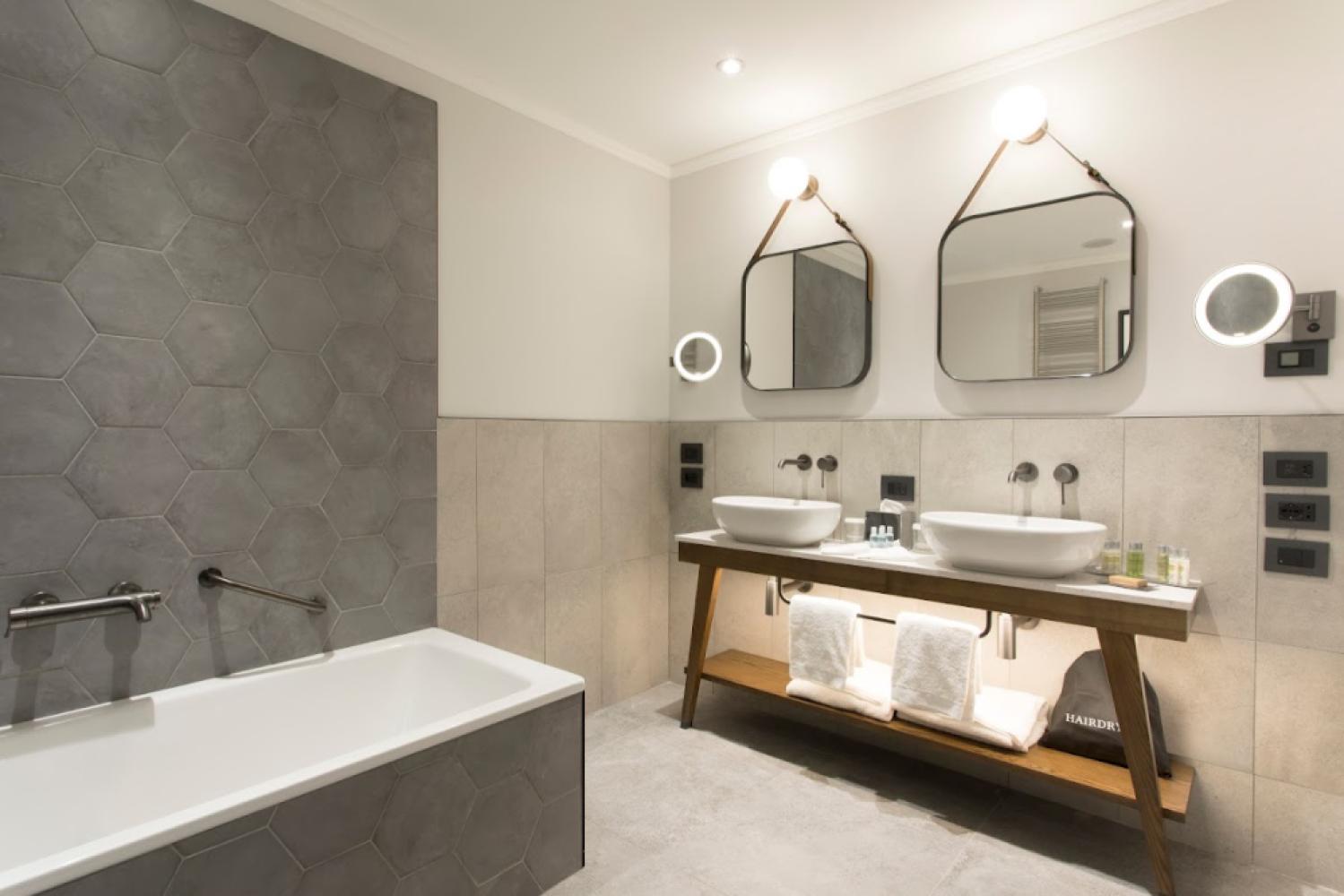 Bathroom - Large, clean, equipped. Plenty of towels. Super hot water. Great pressure. Dramatic lighting.